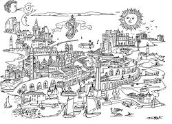 Сильнее всего на фоне всех городов выделяется Cтолица. Именно там располагаются Академия алхимиков и Школа магии, именно там зрители каждый день наслаждаются боями на арене, наконец, именно в Cтолице герои получают квесты и строят золотые храмы во славу своих богов. Остальные же города, на первый взгляд, схожи как близнецы-братья: те же ушлые торговцы, обязательная пивнушка или в лучшем случае бордель, ну и лекари-шарлатаны, предлагающие весьма сомнительные (хотя и вполне работающие в большинстве случаев) методы поправки здоровья. Единственное заметное сразу отличие — это удалённость города от Cтолицы. Но чем больше герой путешествует, тем больше замечает нюансов, о которых, собственно, и делает пометочки на салфетках…