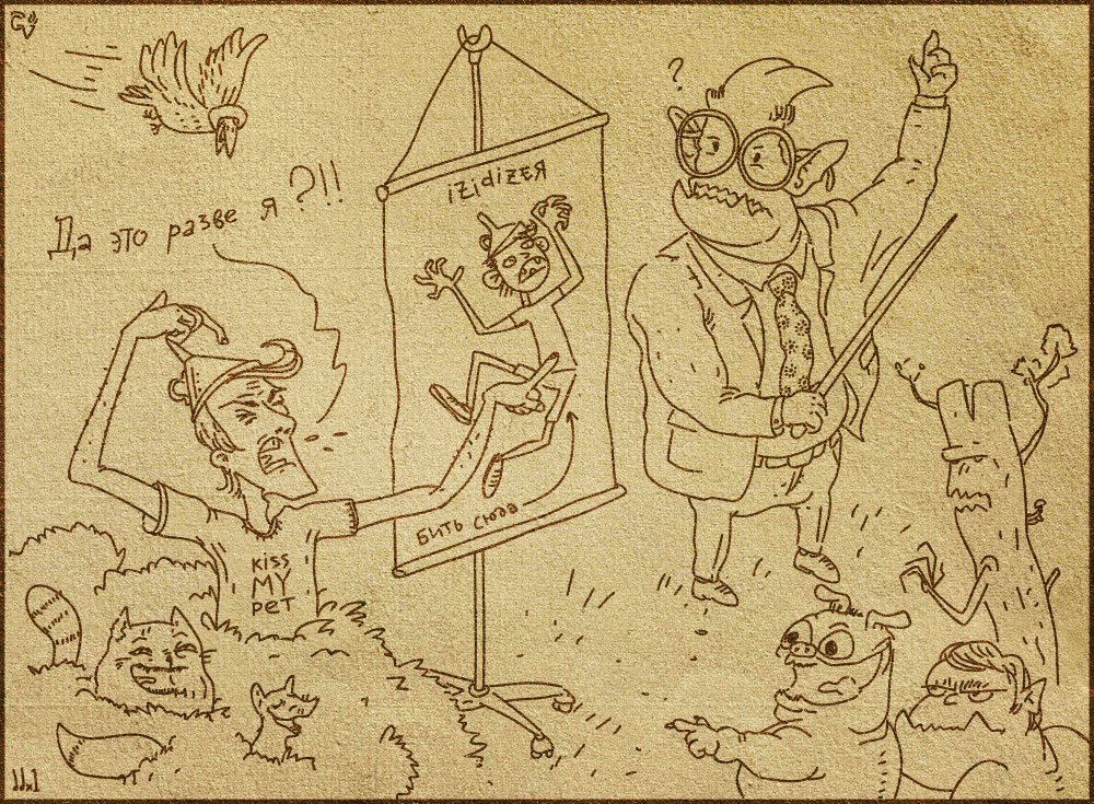 На поляне Подчинитель Примусов что-то рассказывает толпе монстрят, водя указкой по плакату, на котором красуется Heroname. Интересно, это у них урок биологии — или начальной военной подготовки?